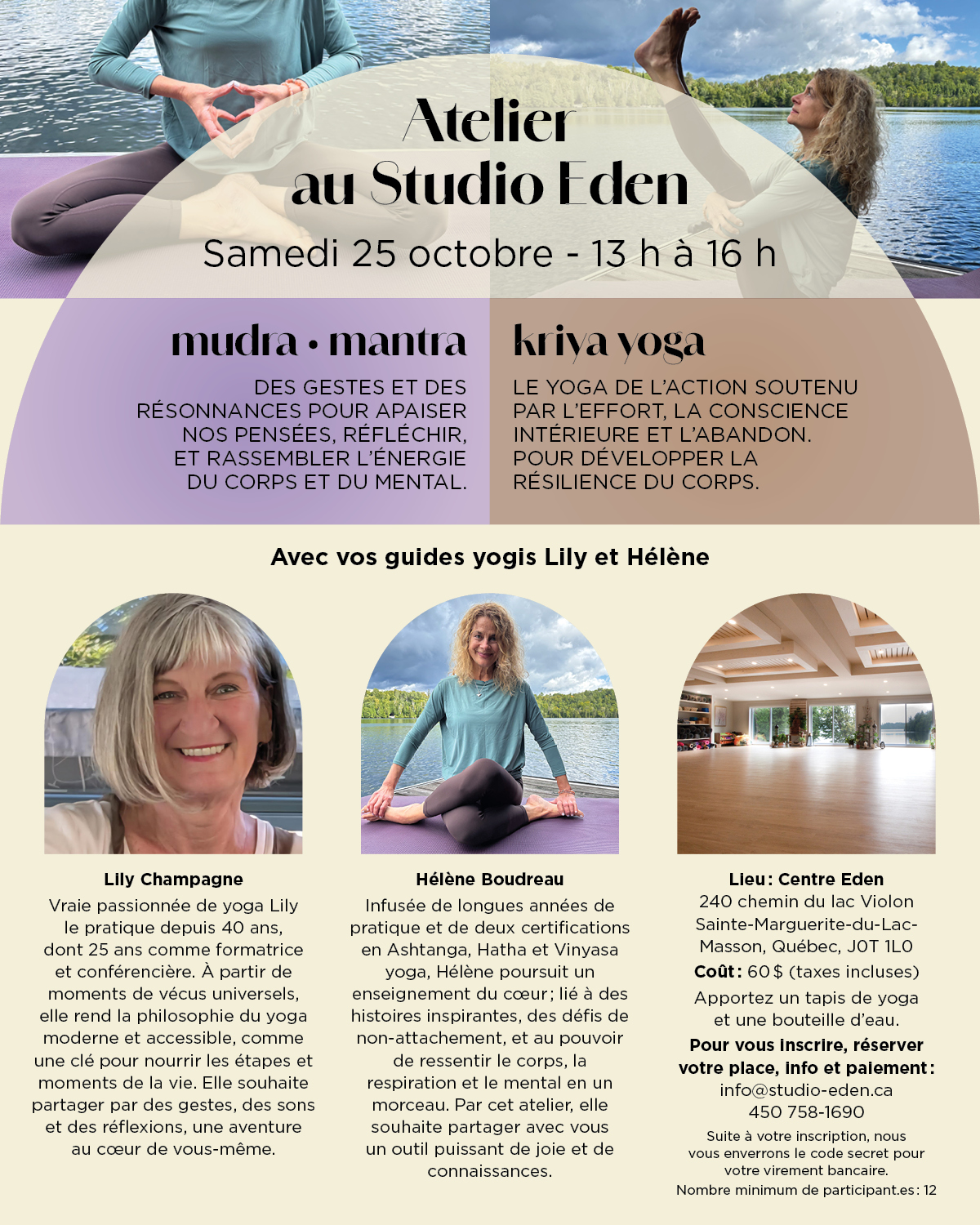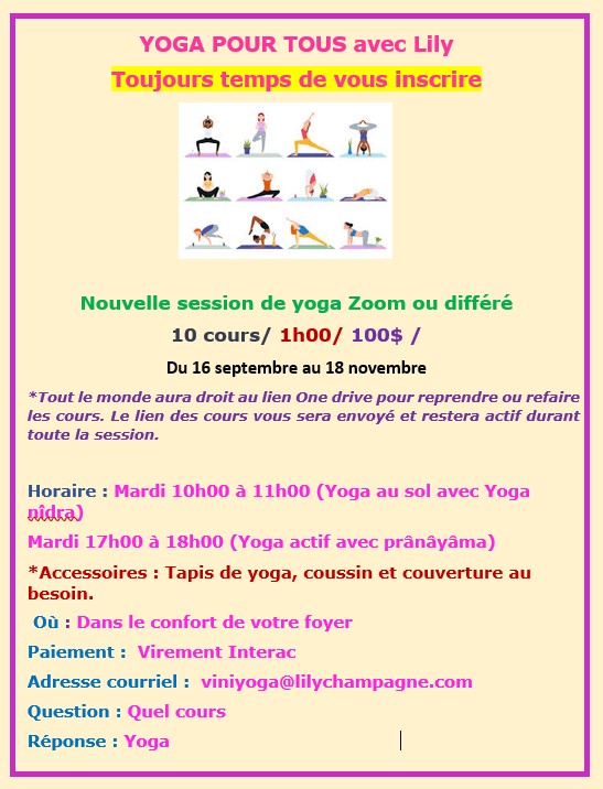 Des cours sur mesure : yoga débutant, intermédiaire, avancé, douceur, en milieu de travail ou encore individuel. Vous trouverez un yoga pour vous.